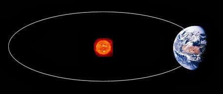 Here in this picture we see that that Earth actually revolves around the sun in an ellipse motion and it isn't perfectly circular. "The radius of this orbit is 150 million km (which is, of course, the distance to the Sun.) and it takes a YEAR (365¼ days), for the Earth to complete ONE orbit, to fit this into the calendar we have 365 days for three years and then 366 days for a leap year." (www.telescope.org/nuffield/pas/earth/earth5.html)